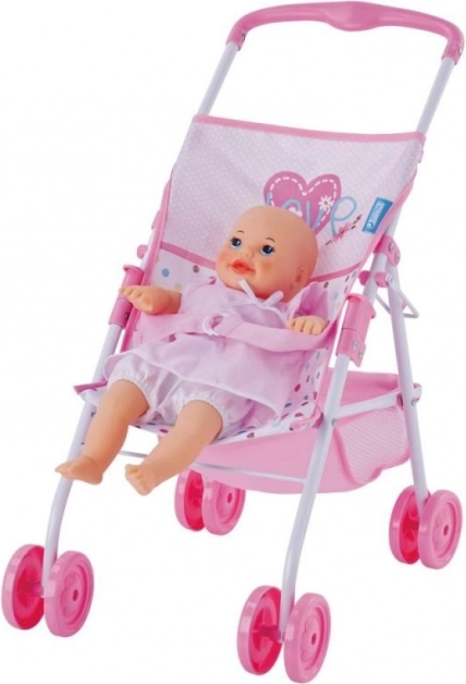 A babakocsi könnyű és könnyen hordozható, rózsaszín kerekekkel és szív mintás üléssel. Ideális beltéri és kültéri játékhoz.