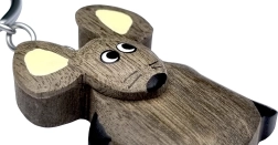 Stílusos, egér alakú fa kulcstartó természetes megjelenéssel és igényes kézi kidolgozással. Tartós és funkcionális kulcstartó kulcsokra, táskára vagy hátizsákra, amely a fém karikának köszönhetően megbízhatóan tart. Legfeljebb ötféle fa természetes színvilágának kombinációja minden darabot egyedi kiegészítővé és kedves, univerzális ajándékká tesz a természetet és állatokat kedvelők számára.