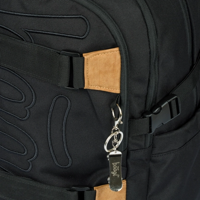 Két elülső pánt a gördeszka rögzítéséhez, tartós vízálló anyag és megbízható YKK cipzárak. A csomag része egy fém függődísz gördeszka formában.