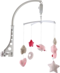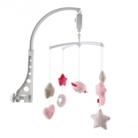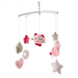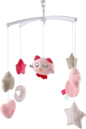 A rózsaszín, bagollyal díszített zenélő kiságyforgó nyugalmat és biztonságérzetet nyújt a babáknak. A puha, függő elemek csillag, szív és holdsarló formában finoman ringanak, miközben a mechanikus, felhúzható szerkezet kellemes dallamot játszik. A halk működés és a vizuálisan barátságos pasztellszínek megteremtik az elalvás előtti megnyugtató hangulatot.