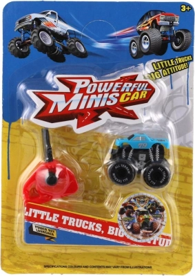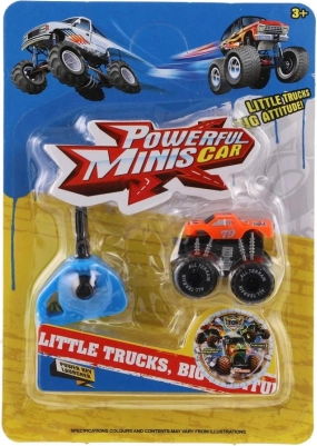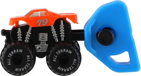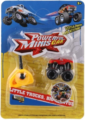 Szórakoztató mini monster truck típusú kisautó kilövő kulccsal a gyors rajthoz – öröm minden kis versenyzőnek. Csak helyezd be a kulcsot a hátsó részbe, nyomd meg a gombot, és az autó kilő előre. A nagy, terepre is alkalmas kerekeknek köszönhetően különböző felületeken is jól boldogul, a kompakt kialakítás és a strapabíró műanyag pedig ideális utazáshoz és otthonra. Az autó hossza: 4 cm. 3 éves kortól ajánlott.