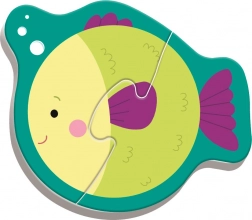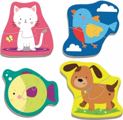 A 4 állat mindegyike csupán 2 nagy darabból áll. A gyerekek könnyen megértik az elvet, és gyorsan átélhetik a kész kép örömét.