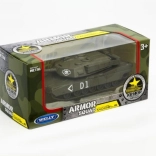 Magasan részletezett tank modell forgó toronnyal és valósághű lánctalpakkal gyűjtőknek és játék céljára.