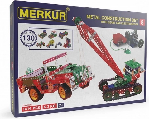 A legendás cseh MERKUR 8 építőkészlet kicsi és nagy mérnököknek 1405 elemet, 5 rétegnyi alkatrészt és akár 130 modellt kínál a mellékelt füzet alapján. Találsz benne traktorkerekeket, lánctalpat, fogaskerekeket és áttételeket, motort és hosszú profilokat – ideális nagy gépekhez, járművekhez és terepmodellekhez, amelyeket az áttételeknek köszönhetően valóban mozgásba hozhatsz.
