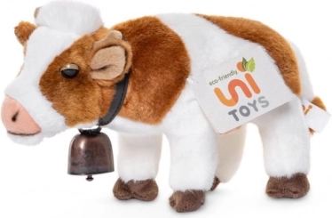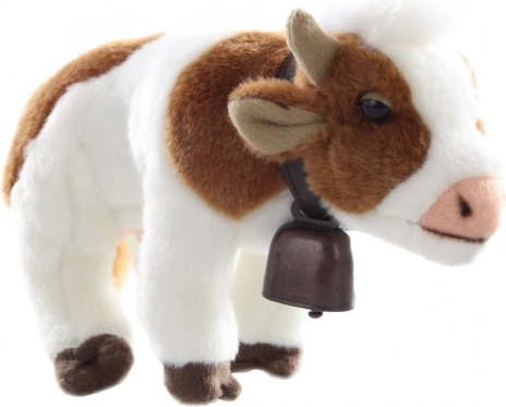 Plüss tehénke csengővel, kb. 25 × 15 × 9 cm. Puha anyag, élethű részletek, biztonságos kivitel. Remek játék 3 éves kortól.