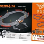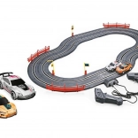A csomag mindent tartalmaz az azonnali versenyzéshez: 2 versenyspeciál, 2 kézi vezérlő és praktikus kiegészítők. A 90 × 65 cm kompakt méretnek köszönhetően az autópálya elfér asztalon vagy a gyerekszobában.