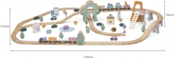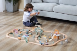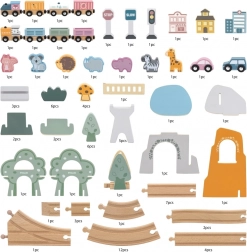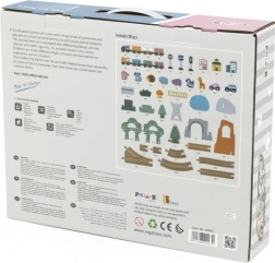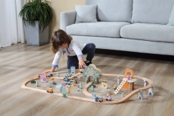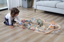 A játék biztonságos és tartós: a sima élek, a vízbázisú festékek és a tömör fa kíméletesek a gyerekekhez és a természethez. A sínek és kiegészítők használata közben a gyerekek gyakorolják a szem–kéz koordinációt, a logikus gondolkodást és az együttműködést közös játék során.