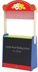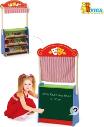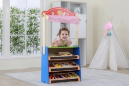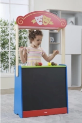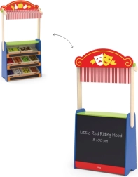 Ez a minőségi fa játék ötvözi az otthoni bábszínházat és a gyerekboltot egyben. A gyerekek pillanatok alatt válthatnak jelenetek és szerepek között – ha mese megy, leeresztik a függönyt, és a fekete táblára felírják az előadás címét; boltos játék közben pedig az üzlet nevét, az árakat vagy az akciókat.
