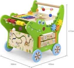 Fedezze fel a VIGA márka krokodil alakú, multifunkciós fa járássegítőjét, amely akár 12 tevékenységet kínál szórakozáshoz és tanuláshoz. Támogatja az első lépéseket, fejleszti a finom- és nagymotorikát, a kéz–szem koordinációt és a logikus gondolkodást. Talál rajta xilofont, számlálót, formaillesztő dobozt, fogaskerekeket, labirintust és további elemeket, amelyek mozgásra és felfedezésre ösztönzik a gyerekeket.