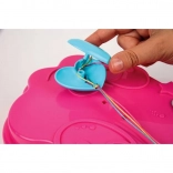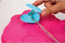 A rózsaszín munkakeret rekeszekkel átláthatóan a helyén tartja a zsinórokat és gyöngyöket, a vezetőhorony pedig segít az öltések/fonalak irányításában fonás közben.