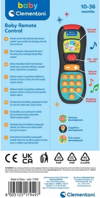 Ez a gyermek távirányító a valódi távvezérlőt utánozza, és a mindennapi játékot felfedezéssé alakítja. A gombok segítségével a gyermek gyakorolja az első számokat, megismeri az állatokat és hangjaikat, miközben fejlődik a finommotorikája. A vidám dallamok és fényhatások további felfedezésre ösztönöznek.