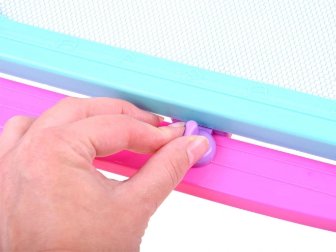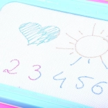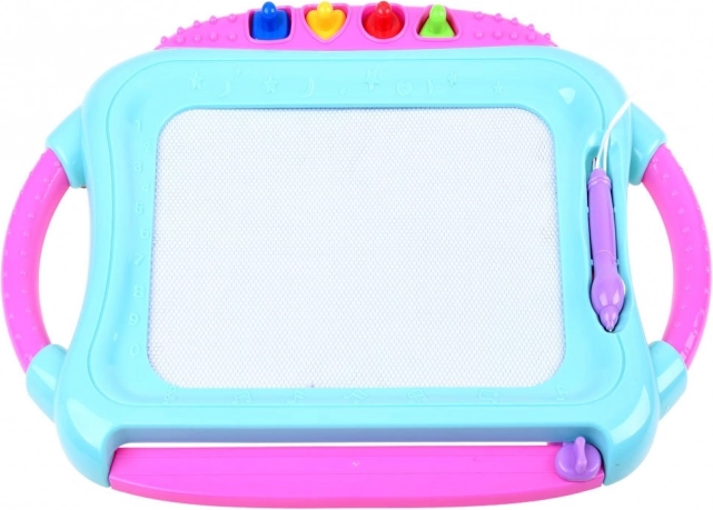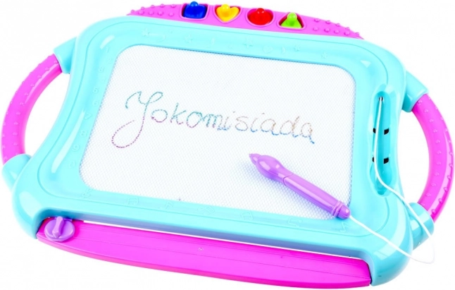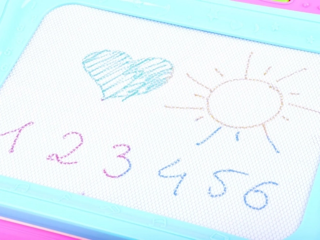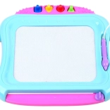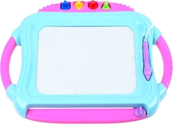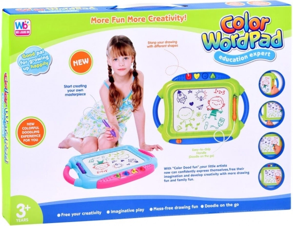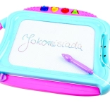 Ez a színes mágneses tábla rendetlenség nélkül teszi lehetővé a rajzolást és írást. A négyszínű háttér a rajzolás helyétől függően változtatja az árnyalatokat, így minden kép élénk, többszínű hatást kap. A gyerekek stylussal alkothatnak, vagy formákat nyomhatnak a pecsétekkel, fejlesztve a fantáziát és a szem–kéz koordinációt.