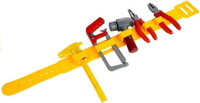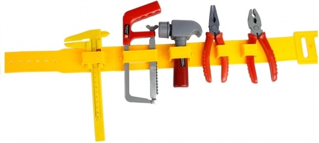 A készlet része egy gyermek szerszámos öv, amelybe elhelyezhetők a kulcsok, a reszelő vagy a csavarhúzó. Ideális a szerszámok szállításához és rendszerezéséhez.