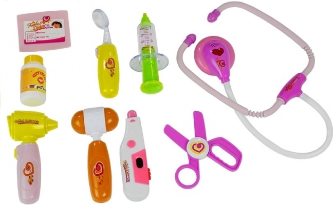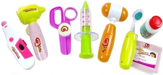 Fecskendő, állítható hőmérő, reflexkalapács, olló és további eszközök ösztönzik a kreatív és tanulságos játékot.