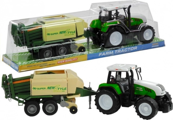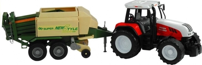 A pótkocsi mozgó alkatrészeket tartalmaz, mint a kihúzható támasz, a forgó begyűjtő-adagoló mechanizmus, valamint a nyitható oldalsó és hátsó ajtók. Ez az izgalmas traktor piros és zöld színben érhető el, ami növeli a hitelességet és a szórakozást.