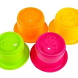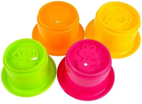A készlet színes, egymásra rakható poharakat tartalmaz madár, földigiliszta és nyuszika mintákkal a további szórakozásért.