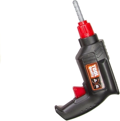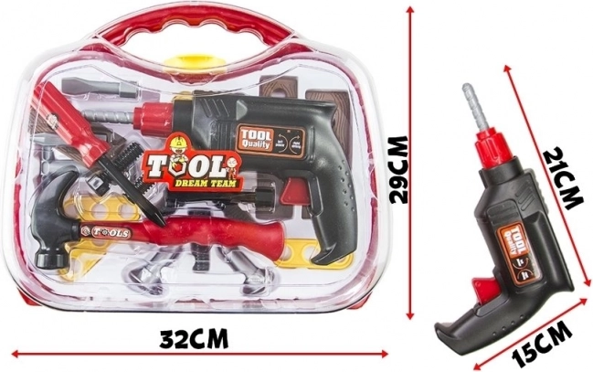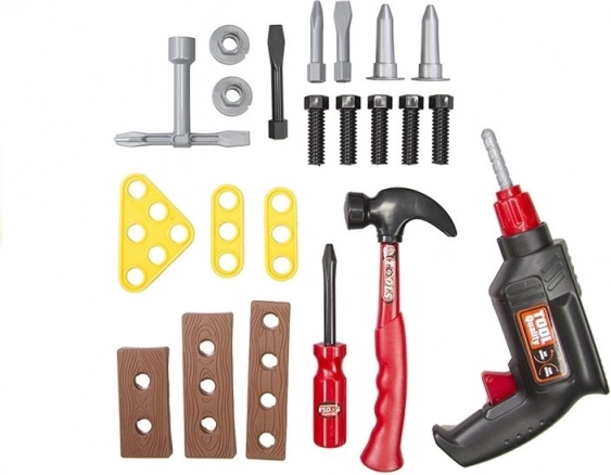 A csomag része egy valósághű játékfúró, egy funkcionális csavarhúzó cserélhető bitekkel, kalapács, csavarok és három szerelőlap a szerelés gyakorlásához. Minden könnyű, tartós, gyerekjátékra biztonságos műanyagból készült.