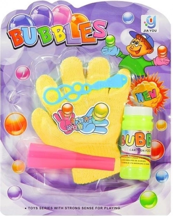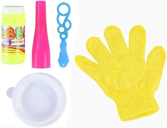 - Kesztyű (univerzális méret), tál/talp az oldathoz, buborékfújó pálca, rózsaszín tölcsér/cső, szappanbuborék-oldat palackban
