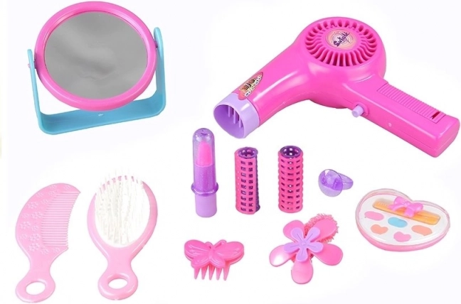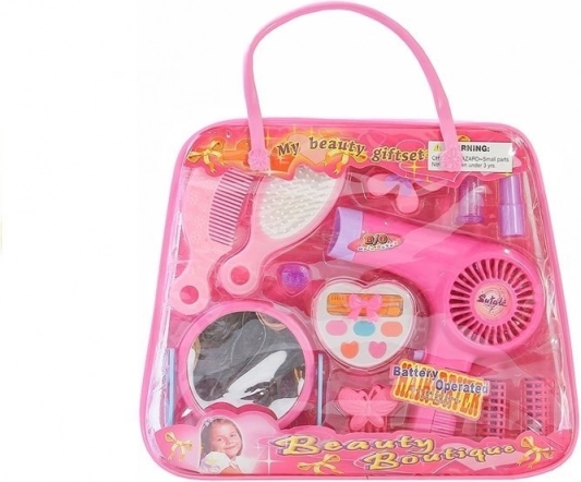 - Gazdag tartalom: elemes hajszárító, állványos tükör, kefe, fésű, 2 hajcsavaró, masnis csat, virágos hajgumi, szemhéjfesték-paletta, rúzs, szívecskés gyűrű.