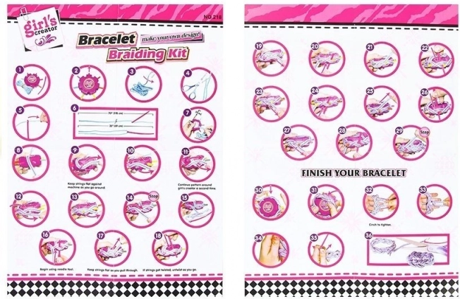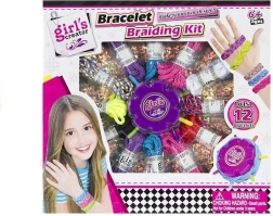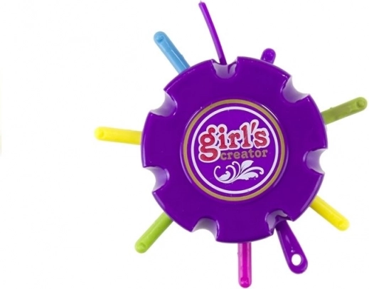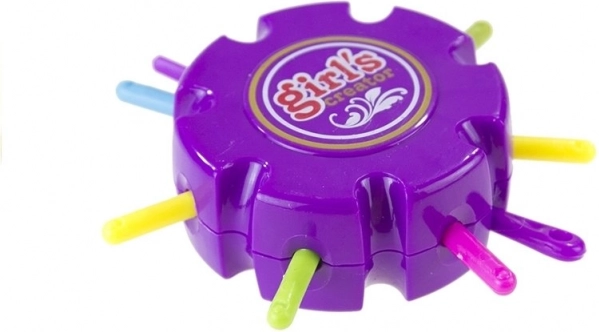 A készlet része egy kör alakú eszköz, amely megkönnyíti a karkötők fonását és segít bonyolult minták létrehozásában.