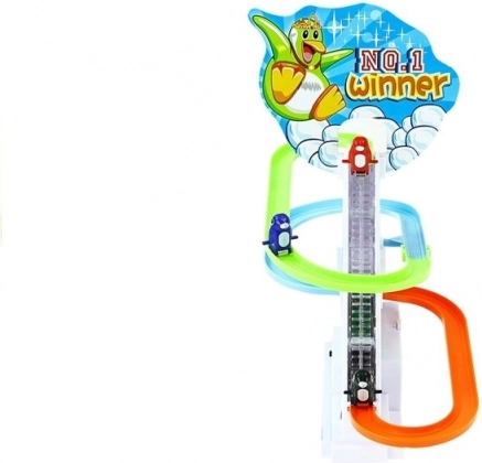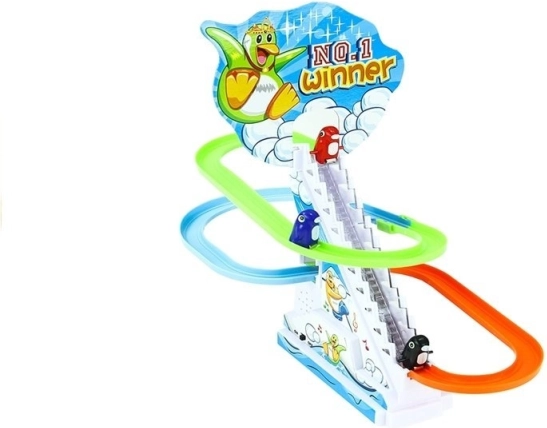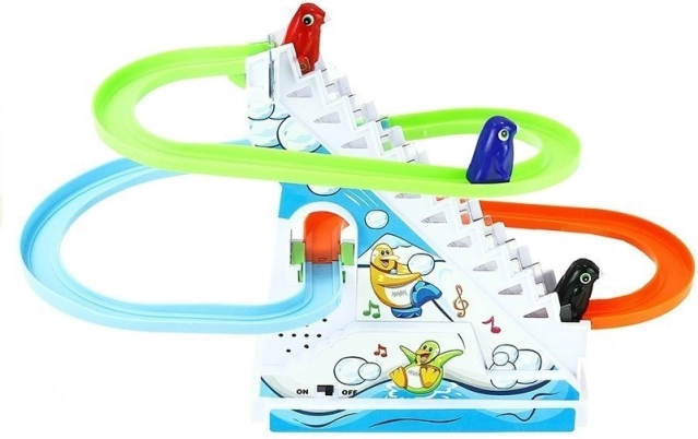A pingvinek lecsúsznak a pályán, miközben vidám dallam szól, ami órákon át tartó örömet és szórakozást nyújt a kicsiknek.