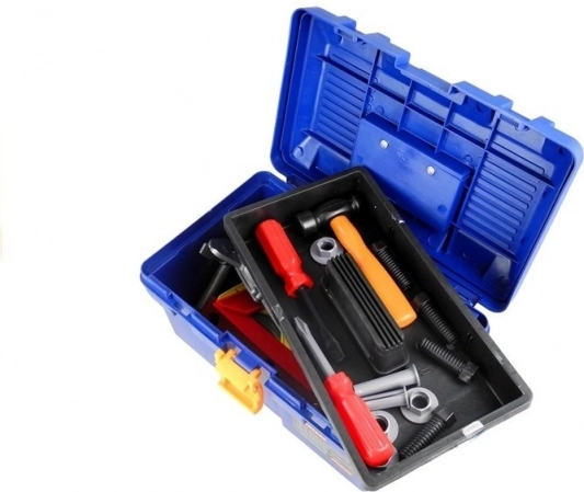- bőrönd, fúró, kalapács, kézifűrész, francia kulcs, villáskulcs, dugókulcs, laposkulcs, csillag csavarhúzó, lapos csavarhúzó, csavarok és anyák, tolómérő, spatula, reszelő, vízmérték, derékszögek, lyukas összekötők