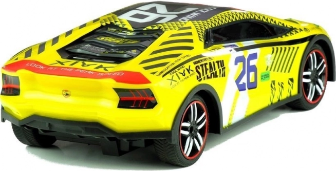 A sárga karosszéria részletes matricákkal és 26-os rajtszámmal 1:14 méretarányban élethű hatást kelt, és csábít a versenyzésre otthon és a szabadban is.