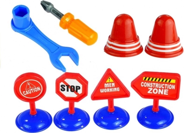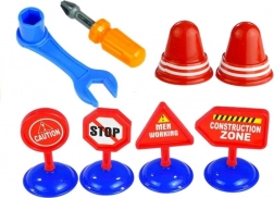 A készlet tartalmaz figurákat, szerszámokat és közlekedési táblákat, amelyek játékos formában tanítják a gyerekeket a szerelők világáról és alapvető eszközökről.