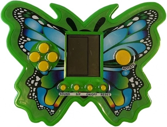 A pillangó formájú elektronikus Tetris játék időtálló szórakozást kínál kompakt és strapabíró kivitelben. Forgasd és illeszd a leeső elemeket úgy, hogy teljes sorokat tölts ki, és szerezz minél több pontot. Minden eltávolított sorral nő a sebesség, így a játék egyre izgalmasabb.