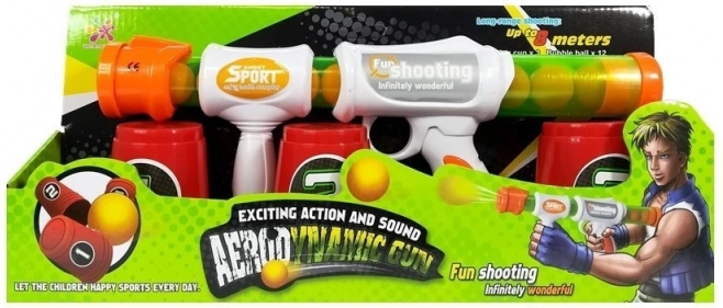 A csomag tartalma 12 puha golyó és több számozott pohár a célzás és a stratégiai játék fejlesztéséhez. A fehér-narancssárga dizájn modern megjelenést kölcsönöz a terméknek, míg a féláteresztő tár lehetővé teszi a rendelkezésre álló lőszer mennyiségének könnyű nyomon követését.