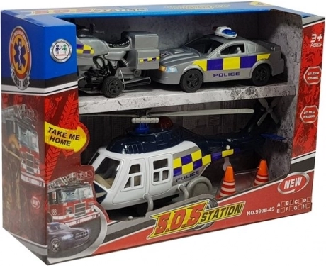 Ez az átfogó, fehér-kék dizájnú rendőrségi készlet mindent megad a gyerekeknek az izgalmas bevetésekhez: szirénás és piros fényű helikoptert, élethű rendőrautót és motorkerékpárt, kiegészítve közúti bójákkal. A játékok hű részletekre és strapabíró kivitelre fókuszálva készültek, hogy bírják az intenzív használatot is.