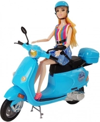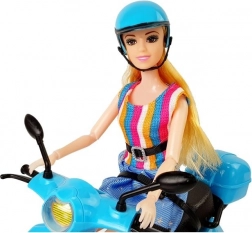 A készlet babája hosszú, szőke hajjal rendelkezik, amely fésülhető és formázható. Stílusos, kék és színes csíkos ruhába öltözött, amely kiegészíti elegáns megjelenését. Mozgatható kezei és lábai megkönnyítik a baba robogóra ültetését, ami lehetővé teszi a gyerekek számára, hogy saját jeleneteket és történeteket alkossanak.