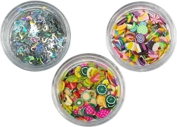 A három lakk, a csillámok és különböző matricák segítségével végtelen dizájnok hozhatók létre.