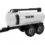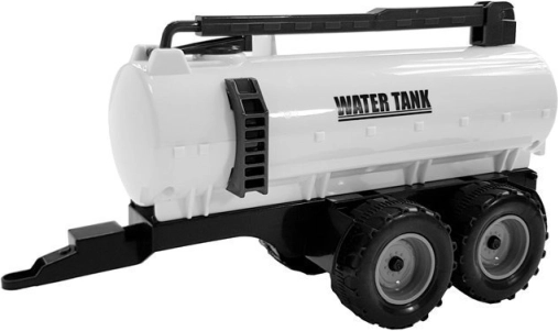Fehér tartálykocsis utánfutó masszív kerekekkel a sima gurulásért. Tökéletes a farmon végzett öntözési jelenetek valósághű megjelenítéséhez.