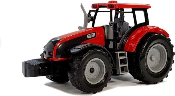 Részletesen kidolgozott traktor nagy kerekekkel és fülkével, amely hiteles szántóföldi élményt nyújt, és könnyedén húzza a kiegészítőket.