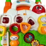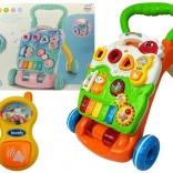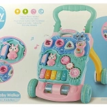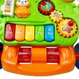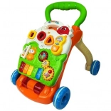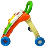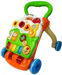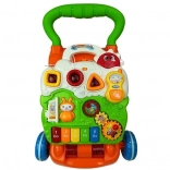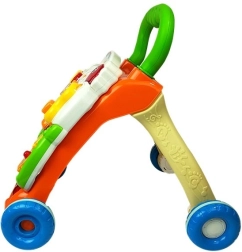 Támogassa gyermeke első önálló lépéseit biztonságos és játékos módon. A színes tolóka masszív fogantyúval, stabil talppal és szilikonpántos kerekekkel rendelkezik az egyenletesebb, kontrolláltabb haladásért. Az interaktív panel 5 billentyűs zongorával, fogaskerekekkel, nyitható ajtóval és egy aranyos nyuszival fejleszti a látást, hallást és a finom motorikát.