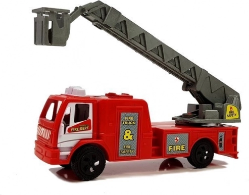 Részletgazdag tűzoltó jármű hosszú létrával, amely támogatja a játékot magasból történő mentésnél és különböző tűzoltási jelenetekben.