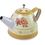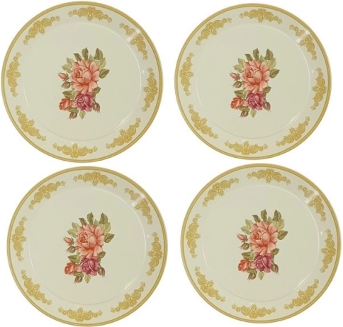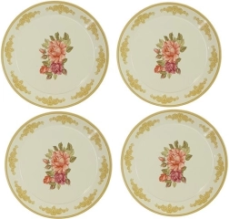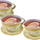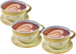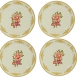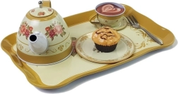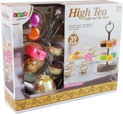 A készlet 4 csészét csészealjjal, 4 desszertes tányért, egy kancsót, tálcát és emeletes tortaállványt tartalmaz.