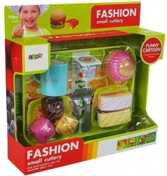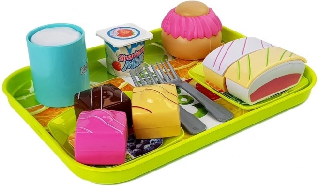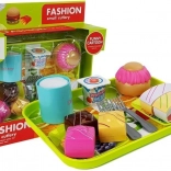 A szett sokféle kiegészítőt tartalmaz – a tálcától a tányérokig és a különféle, élethűen kinéző desszertekig –, lehetővé téve a gyerekeknek, hogy átéljék a főzés örömét.