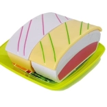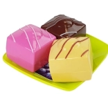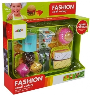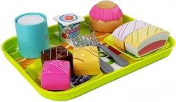 A szett része egy tálca, tányérok, villák, egy joghurtos pohár, különféle tortaszeletek, egy csésze és egy remek homoktorta forma. A készlettel való játék végtelen lehetőséget kínál a vidám szórakozásra.