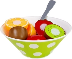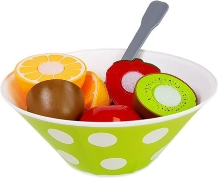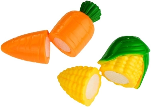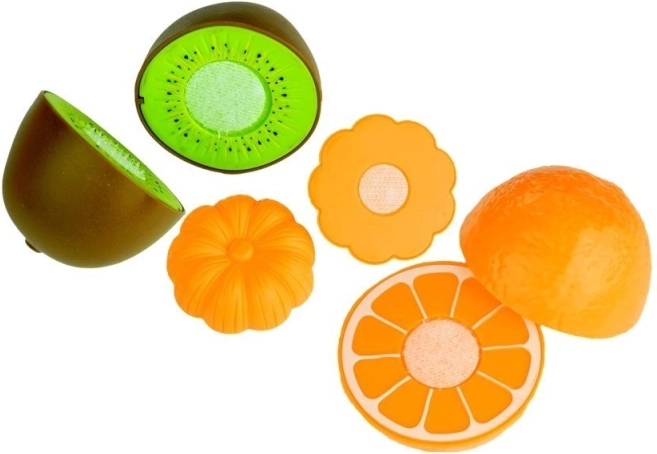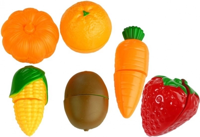 A készlet különböző típusú műanyag gyümölcsöt és zöldséget tartalmaz, amelyeket könnyű szétválasztani és összekapcsolni, elősegítve a motoros képességek fejlesztését.