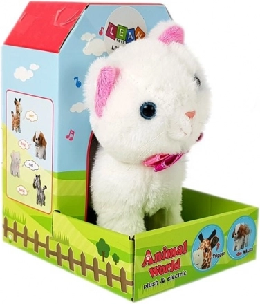 A fül megnyomására a cica nyávog és sétál, gomb lenyomásakor zenét játszik.