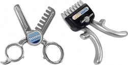 A hajszárító a fogantyú megnyomására megforgatja a színes dobot, a gép pedig az oldalsó gomb eltolására valósághű nyírási hangot ad. A készlet mindent tartalmaz a fésűtől, tükrötől és biztonságos ollótól a trimmeren, játékborotván és „kozmetikumos” üvegcséken át.