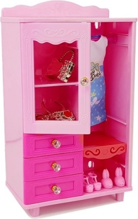 Praktikus szekrény polcokkal és fiókokkal, amely segít a gyerekeknek rendszerezni a baba ruháit, cipőit és kiegészítőit.