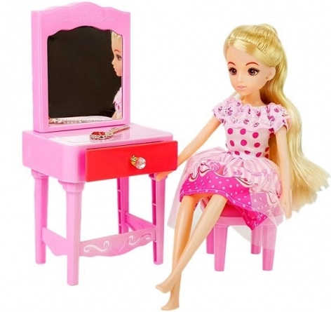 A rózsaszín fésülködőasztal tükörrel és székkel lehetővé teszi frizurák készítését és a baba napi felkészítését.