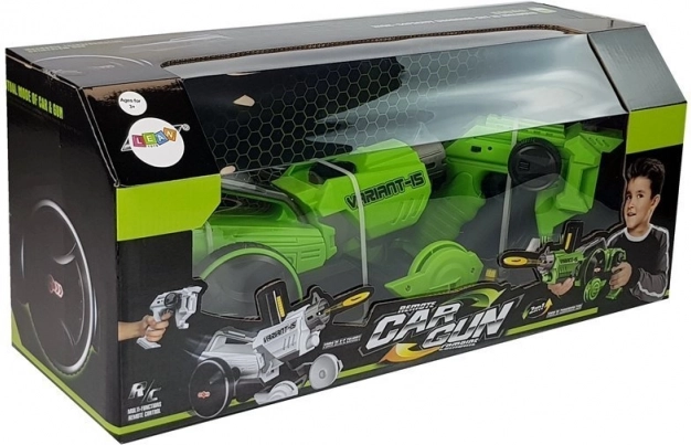 Szórakoztató 2 az 1-ben játék, amely egy pillanat alatt átváltozik a zöld pisztolyból verseny RC autóvá. A 2,4 GHz-es vezérlés biztosítja a sima előre/hátra haladást és a kanyarodást, emellett erős habkorong-lövéssel is rendelkezik. A csomagban 600 mAh Li–ion akkumulátor és USB töltő található – csak töltsd fel, és kezdődhet a játék.