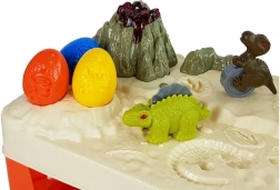 Az asztal világító lávával ellátott vulkánt kínál a játék egy további szintjéhez. A készlet részét képezik a három tojás, melyek egy kis dinoszauruszt rejtenek, és három nagyobb őskori állat a precíz vágáshoz és mintázáshoz. Ezzel fejleszti a gyerekek finom motorikus képességeit és vizuális koordinációját.