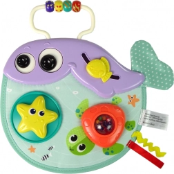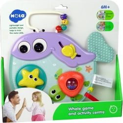 Az interaktív bálna egyesíti a szórakozást és a tanulást egyben. A gyerekek játék közben fejlesztik mindkét kéz koordinációját, a fogást és a koncentrációt. A vidám hanghatásokról a csörgős teknős gondoskodik, a tengeri csillag a saját tengelye körül forog, a további csúsztatható és forgatható elemek a gyöngyökkel felfedezésre csábítanak.
