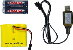 A csomag tartalmaz egy teljes készletet az azonnali használathoz szükséges elemekkel: 4,8 V 700 mAh akkumulátor az autóhoz és két AA elem a távirányítóhoz, valamint egy USB töltő.