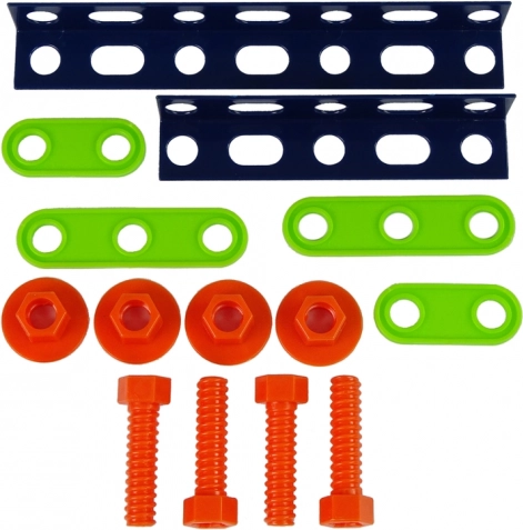 A készletben csavarok, anyák, alátétek és szögek találhatók az első konstrukciókhoz és a finommotorika gyakorlásához.